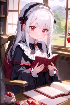 1girl,book,red eyes,open book,sitting,indoors,hairband,reading,frills,window,bow,parfait,black capelet,bangs,food,capelet,hair bow,jewelry,table,chair,brooch,black bow,strawberry,lolita fashion,closed mouth,long sleeves,fruit,upper body,hair ornament,frilled hairband,solo,loli,petite,white hair,straight_hair,long hair,full_shot,landscape,full_shot,landscape,Japanese scene,