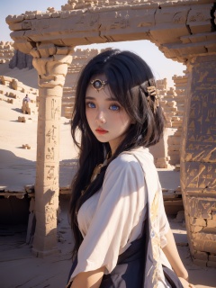 1girl,blue eyes,in egypt,panorama,upper_body,cowboy_shot,,pyramid,heterochromia,yellow eyes, ajkds, DUNHUANG_CLOTHS, chang