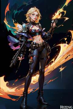 HEZI,Valorante,1girl,solo,blonde hair,weapon,high heels,breasts,gun,holding weapon,science fiction,holding,sniper rifle,electricity,jewelry,earrings,long hair,holding gun,navel,clothing cutout,cleavage,rifle,hair slicked back,hair behind ear,blue eyes,medium breasts,armor,glowing,hoop earrings,cleavage cutout,cropped jacket,character name,animification,open hand,parted lips,full body,standing,midriff,<lora:瓦洛兰特-000013:0.85>,