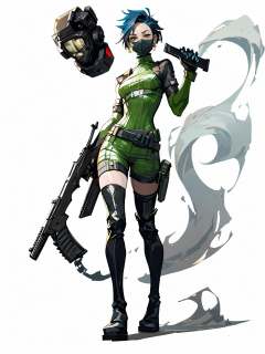 HEZI wa, 1girl, gun, weapon, thigh boots, holding, boots, holding gun, solo, holding weapon, mask, thighhighs, green bodysuit, black hair, bodysuit, medium breasts, white background, gloves, short hair, breasts, open hand, handgun, mouth mask, walking, belt, black footwear, black gloves, black eyes, full body, blue hair, smoke, looking at viewer, looking to the side, skin tight, animification, revolver, elbow gloves, standing<lora:盒子系列——欧美角色设计立﷿:0.85>,