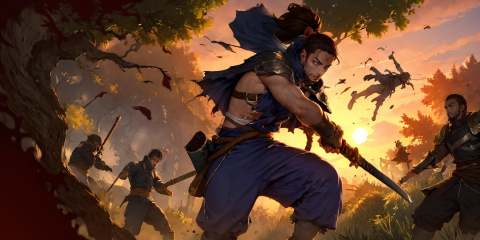 HEZI,LOL,\\\(lol style\\\),game cg,weapon,sword,holding weapon,tree,holding sword,holding,long hair,multiple boys,ponytail,male focus,sheath,outdoors,facial hair,black hair,nature,forest,battle,muscular,shoulder armor,torn,beard,armor,6+boys,katana,jumping,pants,torn clothes,backlighting,ninja,rope,cape,solo focus,sheathed,belt,brown hair,scabbard,midair,sunset,sash,1boy,muscular male,<lora:LOL艾欧尼亚(8bit)2-000008:0.7>,