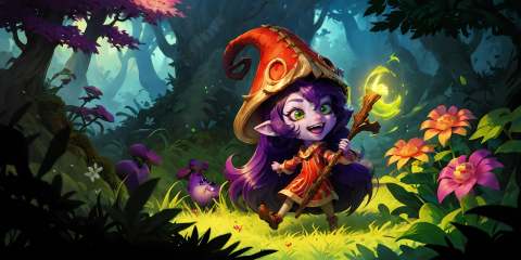 HEZI, LOL, \\\(lol style\\\), game cg, lulu \(league of legends\), 1girl, purple hair, staff, hat, nature, forest, green eyes, open mouth, flower, long hair, yordle, tree, purple skin, colored skin, animal ears, smile, very long hair, witch hat, grass, mushroom, pointy ears, tongue, fairy, dress, teeth, plant, ears through headwear, holding, holding staff, outdoors, :d, vines, red dress, fangs, solo<lora:LOL艾欧尼亚(8bit)2-000008:0.7>,