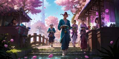 HEZI, LOL, \\\(lol style\\\), game cg, outdoors, multiple boys, multiple girls, tree, smile, white hair, mask, petals, long hair, yordle, black hair, standing, sitting, cherry blossoms, scenery, short hair, water, bare shoulders, waterfall, looking at another, holding, bangs, facial hair, building, leaf, open mouth, weapon, 4boys, hair ornament, alternate costume, brown hair, stairs, beard, teeth, gloves, jewelry, day, pants, japanese clothes, 3boys, closed eyes, ponytail, table, hat, 5boys, glowing, scar, necklace, pointy ears, bridge, breasts, long sleeves, pink hair, hair bun, grin, architecture, official alternate costume<lora:LOL艾欧尼亚(8bit)2-000008:0.7>,