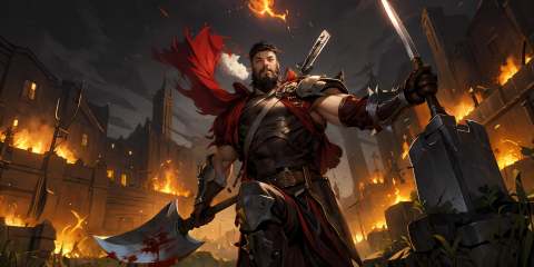 HEZI,LOL,\\\(lol style\\\),game cg,axe,armor,fire,weapon,male focus,shoulder armor,black hair,1boy,muscular,gloves,fingerless gloves,arrow \(projectile\),solo,holding,outdoors,short hair,blood,scar on face,scar,gauntlets,pauldrons,muscular male,manly,spikes,mature male,cape,facial hair,scar across eye,holding axe,holding weapon,beard,one knee,shoulder spikes,tree,war,night,sky,planted,death,looking at viewer,closed mouth,sword,teeth,,<lora:LOL诺克萨斯(8bit)-000009:0.7>,