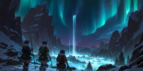 HEZI, LOL, \\\(lol style\\\), game cg, aurora, night, multiple girls, scenery, waterfall, sky, outdoors, star \(sky\), weapon, water, starry sky, night sky, bag, gun, backpack, 3girls, from behind, fur trim, short hair, rifle, staff, holding, mountain, fantasy, boots, 2girls, cliff, coat, standing, rock, hat, tree, skirt, horns, holding weapon<lora:LOL巨神峰_天界(8bit)2-000018:0.6>,