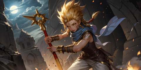 HEZI, LOL, \\\(lol style\\\), game cg, blonde hair, weapon, 1girl, holding, moon, 1boy, yellow eyes, holding weapon, armor, braid, long hair, spiked hair, sword, scarf, magic, bracer, sky, night, glowing, facial mark, full moon, outdoors, tattoo, knife, twin braids, colored skin, fantasy<lora:LOL巨神峰_天界(8bit)2-000018:0.6>,