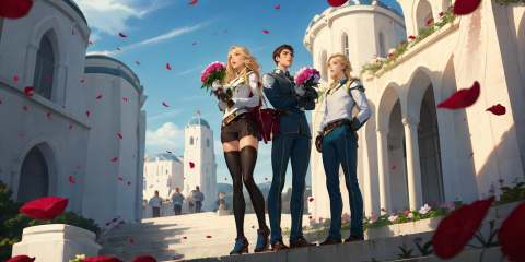 HEZI,LOL,lol style,game cg,blonde hair, petals, multiple boys, bouquet, flower, 2boys, sky, 1girl, gloves, long hair, thighhighs, rose, day, outdoors, hand on hip, brown hair, pants,<lora:LOL德玛西亚(8bit):0.65>,