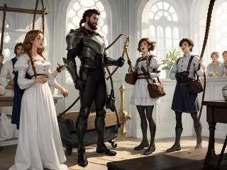 HEZI, LOL, lol style, game cg, brown hair, 1girl, multiple boys, hammer, watercraft, braid, rope, boots, armor, long hair, standing, weapon, open mouth, dress, ship, puffy sleeves, dragon, brown eyes, holding, multiple girls, holding hammer, smile, bird, gloves, indoors, looking at another, 3boys, boat, short hair, horns, fantasy, sword, faceless, beard, twin braids, long sleeves, window, bag,<lora:盒子系列——LOL美宣氛围质感(德玛西亚):0.6>,
