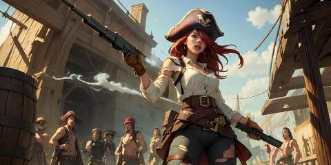 HEZI, LOL, \\\(lol style\\\), game cg, 1girl, dual wielding, gun, hat, weapon, red hair, long hair, blue eyes, holding, hair over one eye, breasts, belt, explosion, handgun, smoke, flag, medium breasts, torn clothes, antique firearm, pants, holding weapon, smoking gun, from below, pirate hat, holding gun, solo, solo focus, shirt, thigh strap, firing, looking at viewer, sky, lips<lora:LOL比尔吉沃特(8bit)-000015:0.6>,