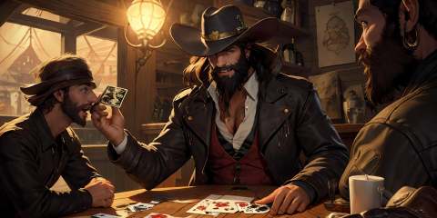 HEZI,LOL,\\\(lol style\\\),game cg,hat,beard,card,male focus,facial hair,glowing,mature male,black hair,multiple boys,long hair,blue eyes,glowing eyes,smile,looking at viewer,cowboy hat,holding,upper body,muscular male,teeth,holding card,1boy,muscular,light,long sleeves,short hair,brown hair,indoors,jacket,open mouth,bara,playing card,hand on headwear,shirt,3boys,closed mouth,solo,solo focus,<lora:LOL比尔吉沃特(8bit)-000015:0.6>,