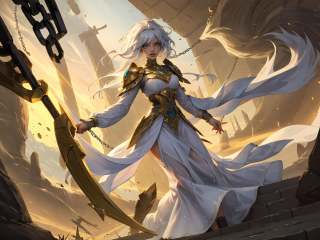 HEHEZI,LOL,\\\(lol style\\\),game cg,1girl weapon, sword, solo, long hair, holding, looking at viewer, armor, blue eyes, holding weapon, white skirt, holding sword, breasts, skirt, white hair, dress, chain, shoulder armor, long sleeves<lora:LOL恕瑞玛(8bit)-000005:0.65>,