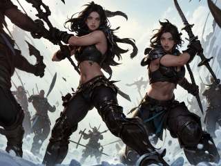 HEZI,LOL,lol style,game cg,long hair,1girl,weapon,black hair,gloves,navel,armor,solo focus,polearm,thighhighs,midriff,dark skin,black gloves,fighting stance,sword,spear,<lora:LOL弗雷尔卓德(8bit):0.65>,