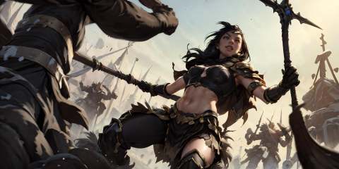 HEZI,LOL,lol style,game cg,long hair,1girl,weapon,black hair,gloves,navel,armor,solo focus,polearm,thighhighs,midriff,dark skin,black gloves,fighting stance,sword,spear,<lora:LOL弗雷尔卓德(8bit):0.65>,