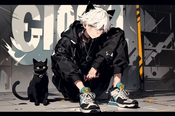 HTTP,1boy, cat, animal ears, white hair, male focus, sitting, black footwear, jacket, black cat, pants, shoes, jewelry, looking at viewer, necklace, short hair, animal, solo, grey eyes, collar, sneakers, black pants, black shirt, long sleeves<lora:HTTP_20231206170112-000012:1>