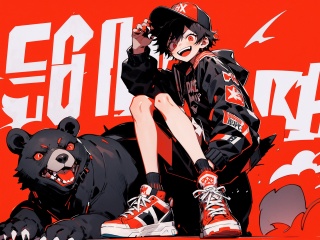 HTTP, jacket, hat, black hair, shoes, open mouth, shorts, black jacket, bear, looking at viewer, male focus, black shorts, 1boy, print jacket, smile, red footwear, long sleeves, shirt, short hair, baseball cap, sneakers, black headwear, solo, claws, red eyes, full body, open clothes<lora:HTTP_20231206170112-000010:1>