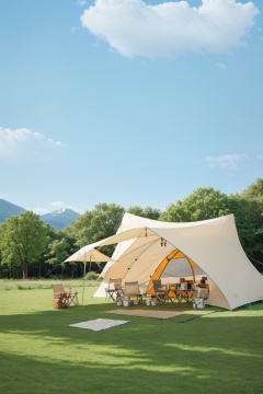sky, landscape, tree, outdoors, grass, mountains, nature, blurred background, blue sky and white clouds, forest, horizon, lake, tent, RAW photo, high resolution, ultra fine section, high detail RAW color photo, professional photo, masterpiece, best quality, RV, stool,
