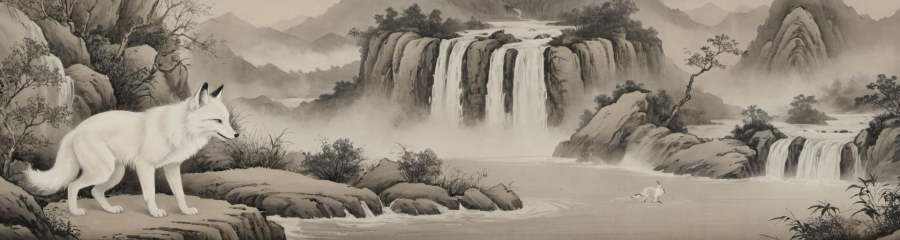 8k, masterpiece, best quality, 2D, traditional chinese ink painting, looking at viewer,1 (white:1.2) [Tiger:Fox:5] with big white tails, (the fox is putting hand into the (water:1.2):1.4), alarmed, (fearful:1.3), 1 grey_fish was jumped out from the water,background is river and grey_sand, (fog:1.4), smoke, many waterfalls, Distant and layered mountains,ink, <lora:watercolor-ink-sketch-v1:0.4>,