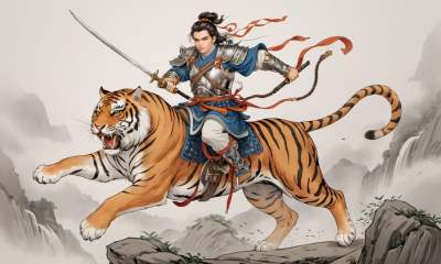 8k, masterpiece, best quality, 2D, (traditional chinese ink painting:0.2),1 perfect face warrior, 1 warrior with a lot of weapon is riding a Tiger which is jumping higher and higher,simple background,