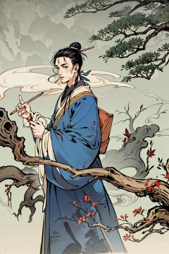 gufeng,1boy,male focus,solo,single hair bun,holding,hair bun,tree,paintbrush,holding paintbrush,upper body,robe,smoke,branch,black hair,