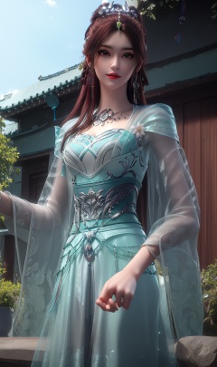 masterpiece,(best quality),official art, extremely detailed cg 8k wallpaper,((crystalstexture skin)), (extremely delicate and beautiful),highly detailed,1girl,solo,long hair,headwear,(standing),( hair),(( dress)),, (chinese_clothes),sweet smile,((upper body)), (medium breasts),((hair_ornament)),,(long_dress),(clothes),(dress),(chinese_clothes),(long_skirts),(sunshine, outdoor,),((looking_at_viewer)),((Facing the camera)),, <lora:hipoly3DModelLora_v10:0.3>