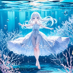 wide shot, (solo:1.3), dramatic angle, (underwater:1.2), masterpiece, best quality, intricate detail, 1girl, swimming, loli, (long hair:1.2), solo, expressionless, blue eyes, looking_up, shoulder strap dress, floating hair, floating clothes, god rays, bubble, barefoot, (full body:1.2), outstretched arm, , perfect hands,