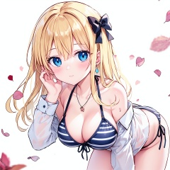 1girl, solo, breasts, blonde hair, long hair, cleavage, shirt, striped, swimsuit, bikini, bow, looking at viewer, hair bow, striped bikini, white shirt, necklace, blue eyes, jewelry, dress shirt, front-tie top, pink bow, bangs, blush, off shoulder, long sleeves, large breasts, collarbone, front-tie bikini top, collared shirt, hand up, closed mouth, open shirt, open clothes, bare shoulders, petals, blurry, leaning forward, halterneck, heart, very long hair, white background, depth of field, pink bikini, hair between eyes