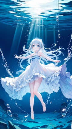 wide shot, (solo:1.3), dramatic angle, (underwater:1.2), masterpiece, best quality, intricate detail, 1girl, swimming, loli, (long hair:1.2), solo, expressionless, blue eyes, looking_up, shoulder strap dress, floating hair, floating clothes, god rays, bubble, barefoot, (full body:1.2), outstretched arm, , perfect hands