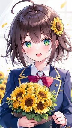 1girl, flower, sunflower, solo, virtual youtuber, hair ornament, yellow flower, green eyes, ahoge, hair flower, smile, sunflower hair ornament, open mouth, jacket, bangs, bow, :d, shirt, collared shirt, white shirt, red bow, looking at viewer, upper body, blue jacket, upper teeth only, holding, hair between eyes, teeth, brown hair, bowtie, blazer, blush, red bowtie, school uniform, bouquet, medium hair, short hair, bubble, blurry