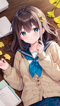 1girl,solo,school uniform,lying,green eyes,on back,brown hair,looking at viewer,on floor,book,serafuku,blue neckerchief,sailor collar,white shirt,neckerchief,leaf,blush,cardigan,shirt,ginkgo leaf,ginkgo leaf,open clothes,bangs,twitter username,parted lips,open cardigan,collarbone,long sleeves,holding leaf,holding,wooden floor,hair between eyes,upper body,long hair,indoors,brown cardigan,skirt,from above,autumn leaves,blue sailor collar,notebook,