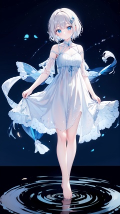 Best quality,8k,cg,night,glowing,transparent,barefoot,1girl,standing_on_liquid,ripples,sparkler,dress,Formed by light,starry_background,