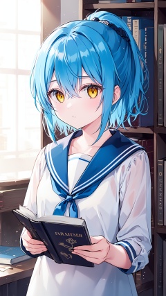 book, 1girl, yellow eyes, bookshelf, library, blue hair, solo, bangs, hair between eyes, parted lips, ponytail, looking at viewer, blurry background, blurry, holding, indoors, short hair, blue sailor collar, sailor collar,,,,,,