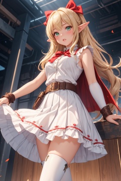 best quality,(masterpiece:1.3),cowboy shot,ultra-detailed,solo,1girl, arisa \(shadowverse\), from below,long hair, bangs, ribbon, pointy ears, hair ribbon, elf, blush, blonde hair, red ribbon, hair between eyes, green eyes, skirt, sleeveless, dress, bare shoulders, shirt, belt, sleeveless shirt, thigh boots, white skirt, frills, brown footwear, pleated skirt, miniskirt, sidelocks, blue shirt, sleeveless dress, white dress, short dress, red cape, brown belt, buckle, red bow, knee boots, high heels, armlet