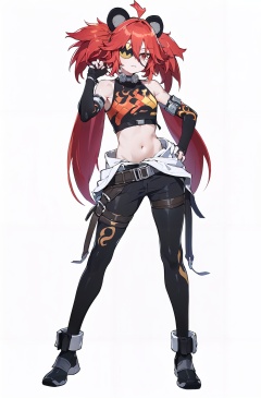 8k, best quality, masterpiece, (ultra-detailed:1.1), (high detailed skin), (full body:1.2), white background, standing, looking at viewer, (solo:1.4), hand on hip, <lora:koleda-v100:0.85:lbw=OUTALL>, koleda, 1girl, fingerless gloves, gloves, long hair, black gloves, navel, animal ears, red hair, belt, eyepatch, twintails, midriff, ahoge, hair between eyes, (white background, simple background:1.5), (beautiful_face), ((intricate_detail)), clear face, ((finely_detailed)), fine_fabric_emphasis, ((glossy)), full_shot