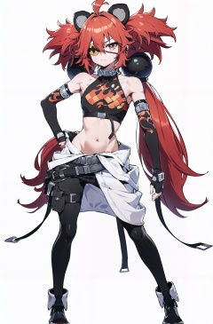 8k, best quality, masterpiece, (ultra-detailed:1.1), (high detailed skin), (full body:1.2), white background, standing, looking at viewer, (solo:1.4), hand on hip, <lora:koleda-v100:0.85:lbw=OUTALL>, koleda, 1girl, fingerless gloves, gloves, long hair, black gloves, navel, animal ears, red hair, belt, eyepatch, twintails, midriff, ahoge, hair between eyes, (white background, simple background:1.5), (beautiful_face), ((intricate_detail)), clear face, ((finely_detailed)), fine_fabric_emphasis, ((glossy)), full_shot
