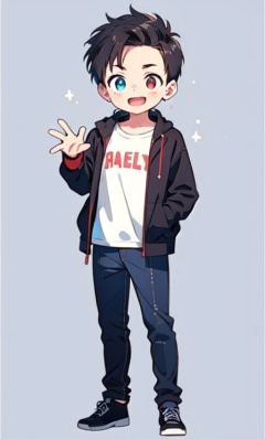 (((1boy))),elegant,as-youngest,((((full body)))),standing,a pure white background,(((solo))),CENTER VIEW,childish,complete shoes,(((simple background))),black hair,heterochromatic pupil,(((left red eye and right blue eye))),open mouth,extremely pleasant,(((happy))),lively,casual daily clothing,<lora:2023-05-13_224157:1>,, fcportrait