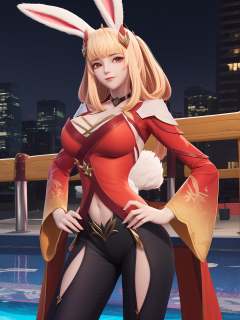 WZRYgongsunliYP, 1girl, solo, rabbit ears, navel,looking at viewer, breasts, clothing cutout,long hair,choker, blonde hair, wide sleeves, pants, navel cutout, long sleeves,  pants, bangs, hair ornament, medium breasts,dress, <lora:WZRYgongsunliYP:0.75>,cityscape, night, pool,