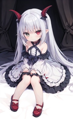 (very long hair,cowboy shot,4349,4349,4349:1),1girl,long hair,tail,pointy ears,heterochromia,two side up,demon tail,red footwear,dress,red eyes,demon girl,shoes,sleeves past wrists,mary janes,detached sleeves,collar,looking at viewer,horns,solo,