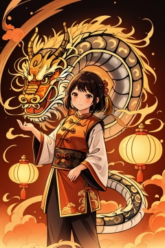 , Kids, Masterpiece, Yaoyao (Primordial Shock), WZRYsunshangxiangYJLQ, Wonder Woman, blkwidow, DLY, kuki shinobu, 1girl, reigLeblancYS, dragonhead, Chinese dragon_imagination_traditional Chinese painting_ancient painting_ink and wash style_cloud around_fire cloud_light black dragon_black gold color matching_fangs_mouth opening_fierceness_cloud around and flame.