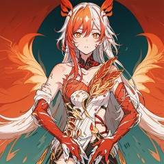 (masterpiece:1.3), (the best quality:1.2), (super fine illustrations:1.2), (Masterpiece), high quality, high detail,(white background:1.2), looking at viewer, (SOLO:1.4),outline,,simple background,armor,red legwear,thighhighs,boots,facial mark,head wings,red gloves,two-tone hair,earrings,gloves,tassel,leotard,skirt,dress,elbow gloves,twintails,bare shoulders,tattoo,phoenix,ribbon,red ribbon,bangs,white hair,orange eyes,streaked hair,fu hua,orange hair,fiery hair,hair between eyes,multicolored hair,fiery wings,jewelry,hair ornament,gloves,hair ribbon,pattern on hair,logo,yellow pupils,diamond shaped pupils,