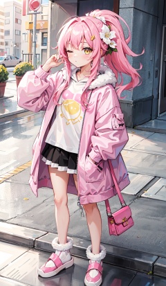 1petite loli, solo.pink hair, long pink hair, (yellow eyes),puffy sleeves,fur-trimmed jacket, hair flower, fipped hair, high ponytail, loose over_sized Casual T-shirt, white shirt, hoodie coat, bare legs, slippers;relaxed, one-eye_closed, adjusting hair, looking at viewer, standing.