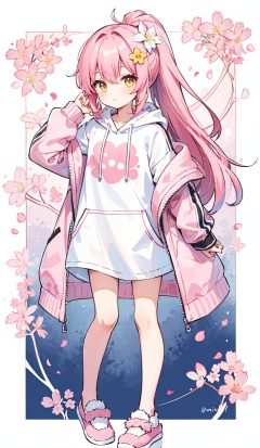 1petite loli, solo.pink hair, long pink hair, (yellow eyes),puffy sleeves,fur-trimmed jacket, hair flower, fipped hair, high ponytail, loose over_sized Casual T-shirt, white shirt, hoodie coat, bare legs, slippers;relaxed, one-eye_closed, adjusting hair, looking at viewer, standing., yinyou,yinyou color