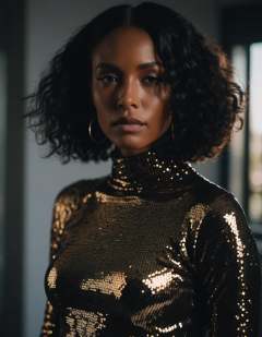 a character photo portrait of a Barbadian woman with brunette hair Wearing a modern, cut-out turtleneck sweater with a sequined midi skirt., unsplash, light and space, dramatic light on face, realistic face moody lighting, light falling on face