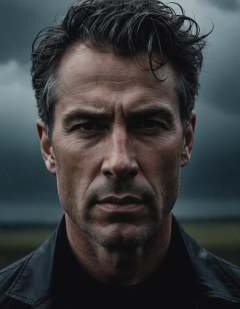 Close-up portrait of a man, tense expression, stormy weather backdrop, dramatic lighting, reminiscent of Ansel Adams' work