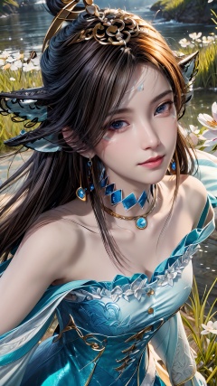 masterpiece,best quality,official art,extremely detailed CG unity 8k wallpaper,realistic,light rays,light particles,1girl,solo,medium chest,in a meadow,stream,mountain,cherry_blossoms,flower,outdoors,long_hair,earrings,(hair_ornament:1.2),dynamic pose,looking at viewer,(cowboy shot:1.2),
