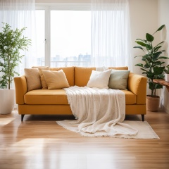 Interior, modern light luxury minimalist style, super wide Angle, soft light, white walls, sofa, sofa blanket, throw pillows, large picture window, 1 pot plant, white tulle curtain, early morning, RAW color photos, professional photos, masterpieces, best quality, realistic