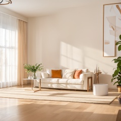 Interior, modern light luxury minimalist style, super wide Angle, soft light, white walls, large floor-to-ceiling Windows, 1 pot plant, white tulle curtains, early morning, RAW color photos, professional photos, masterpieces, best quality, realistic