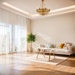 Interior, modern light luxury minimalist style, super wide Angle, soft light, white walls, large floor-to-ceiling Windows, 1 pot plant, white tulle curtains, early morning, RAW color photos, professional photos, masterpieces, best quality, realistic