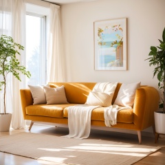 Interior, modern light luxury minimalist style, super wide Angle, soft light, white walls, sofa, sofa blanket, throw pillows, large picture window, 1 pot plant, white tulle curtain, early morning, RAW color photos, professional photos, masterpieces, best quality, realistic