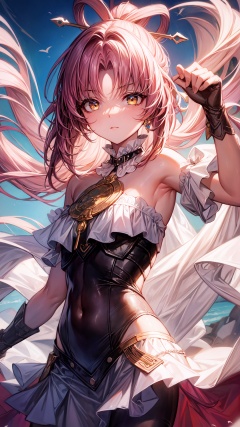 fuxuan, , fu xuan, (yellow eyes:1.5), forehead jewel, hair ornament, hair stick, long hair, low twintails, parted bangs, pink hair, twintails, BREAK bare shoulders, black dress, bridal gauntlets, detached collar, detached sleeves, dress, jewelry, neck ring, pantyhose, skirt, white pantyhose, white skirt, BREAK looking at viewer, upper body, fully body, BREAK outdoors, BREAK , (masterpiece:1.2), best quality, high resolution, unity 8k wallpaper, (illustration:0.8), (beautiful detailed eyes:1.6), extremely detailed face, perfect lighting, extremely detailed CG, (perfect hands, perfect anatomy),