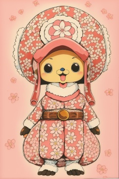 belt, cherry blossoms, daisy, floral print, flower, hat, no humans, open mouth, paw print, pink flower, simple background, smile, traditional media, white flower